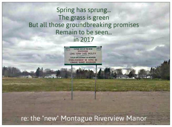 It is with great relief that I can write this post. Since last October I’ve been blogging about Prince Edward Island’s unfulfilled government promise to replace the rundown Riverview Manor for seniors in Montague. It’s been a frustrating route from my first writing to this past week when, finally, the machines started showing up, the office trailer placed, and ground was broken.
